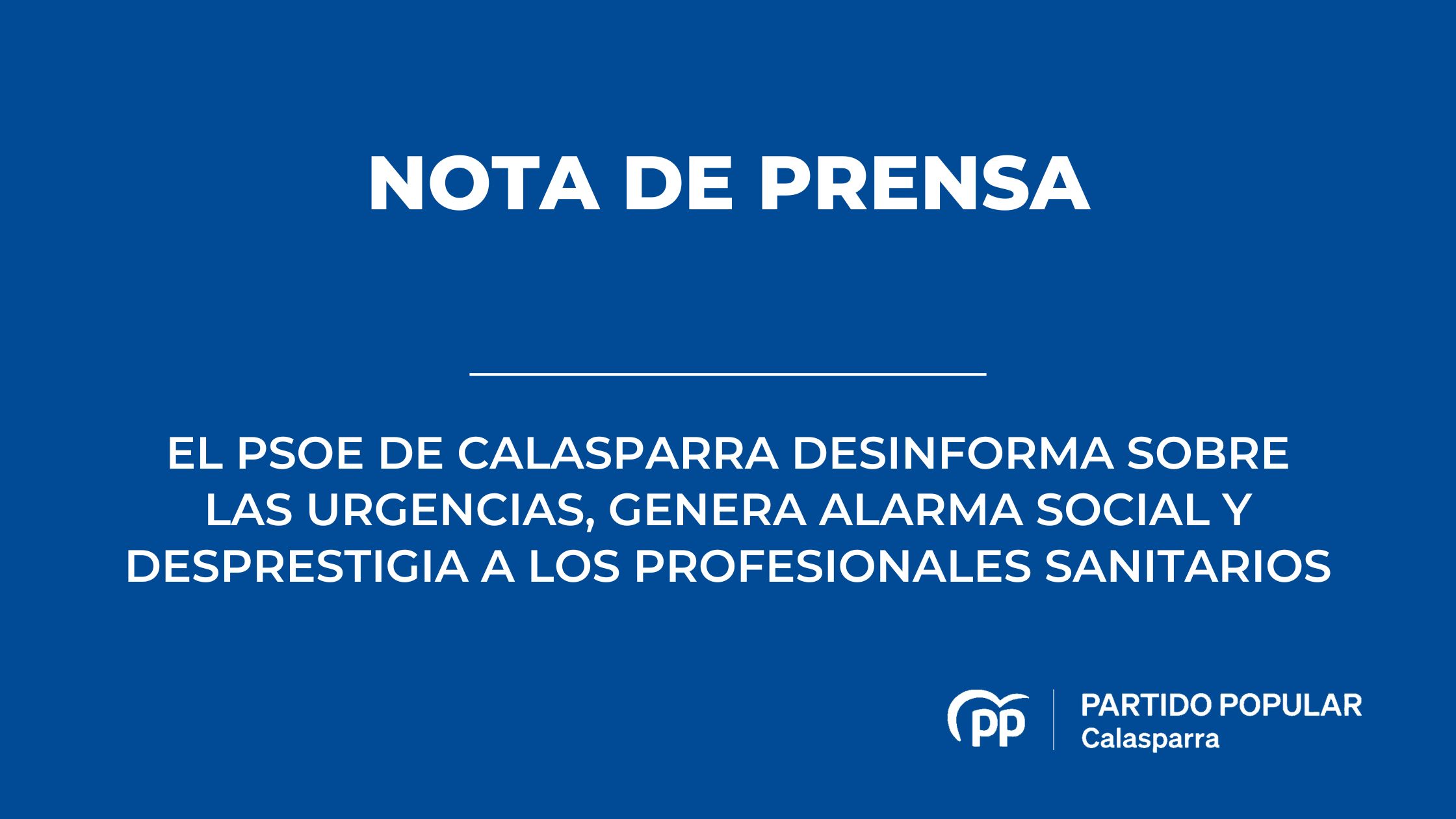 El Partido Popular de Calasparra denuncia la grave irresponsabilidad del PSOE de Calasparra, de Marea Blanca y de la alcaldesa del municipio por la campaña de desinformación, alarmismo y manipulación que están llevando a cabo en relación con el refuerzo del servicio de urgencias del Centro de Salud. Utilizar la sanidad para sembrar miedo entre